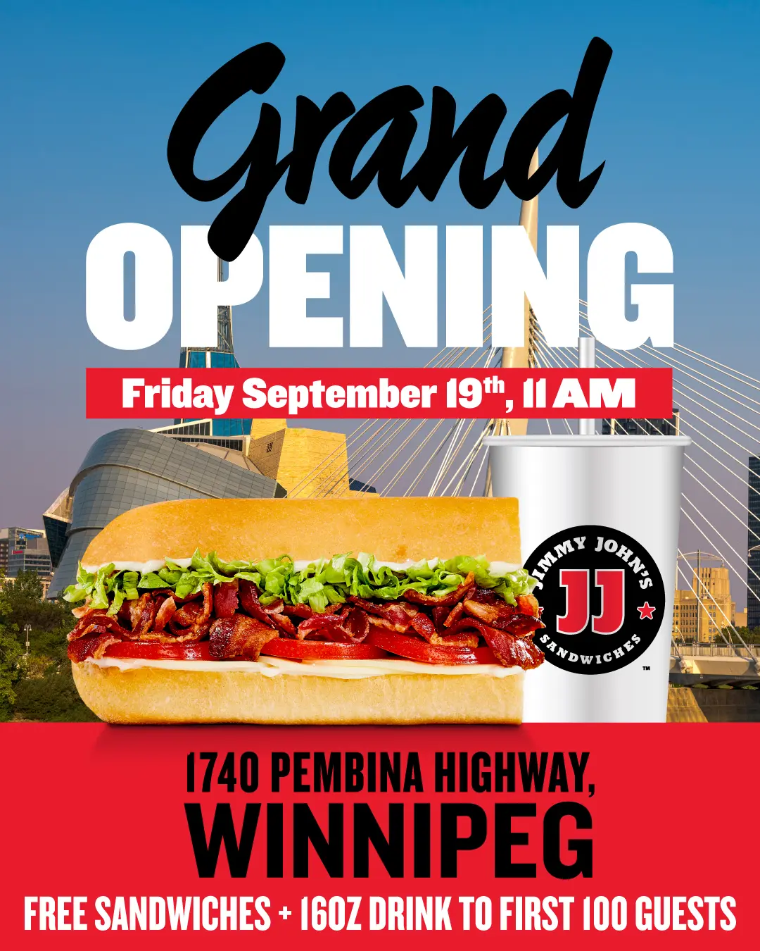 Looks like Jimmy John’s is finally opening in Winnipeg at 1740 Pembina Highway on Friday, September 19, 2025, and things kick off at 11 AM. The cool part? The first 100 people in line get a FREE sandwich and a 16 oz drink. 🥪🥤