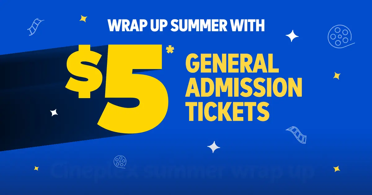 Cineplex Summer Wrapup delivers $5 general admission and $5 small popcorn for a limited weekend at participating theatres. Moviegoers get budget-friendly big-screen fun with optional IMAX, UltraAVX, or VIP upgrades.