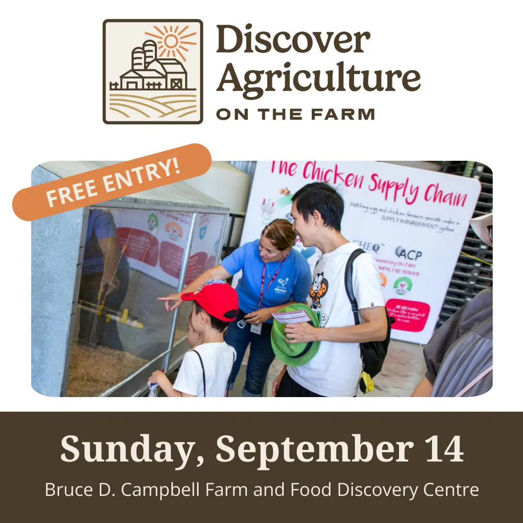 Join us for Discover Agriculture on the Farm on Sunday, September 14 from 10 am to 2 pm at the Bruce D. Campbell Farm & Food Discovery Centre. This free, one-day open house offers visitors a chance to explore the vibrant and innovative world of Manitoba agriculture. Meet local farmers, see farm animals up close including broiler chickens, dairy cows, laying hens, and pigs. There will be free food samples (while supplies last), fun activities, and prizes to take home.